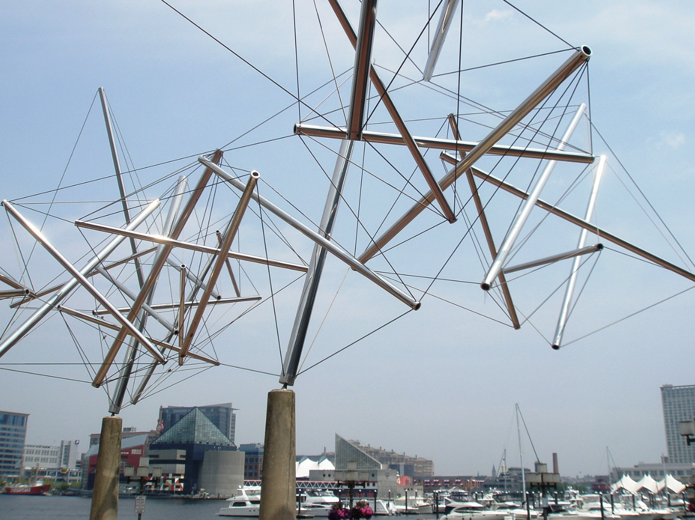 Tensegrity is currently a popular term being talked about in almost every somatic field. Let's explore exactly what the word means and the implications it has for a movement and Pilates practice. The word 'tensegrity' is a combination of two words - tension and integrity. It refers to the strength or integrity of structures as being based on the balance of tension and compression components. The word was first coined by Kenneth Snelson, then popularized by Buckminster Fuller and now appears in many places including in the work I teach, Thomas Myers' Anatomy Trains. Once the principles are understood, and felt in the body they evoke a lightness and efficiency in movement. I took the picture below while on holiday in Europe. It shows a portion of one of Snelson's sculptures (part of a 130 foot mast). Notice that the metal poles don't touch, but remain stable in relation to their neighbors. The shape is maintained but by a balance of tension across the entire structure, not by rigid joints.